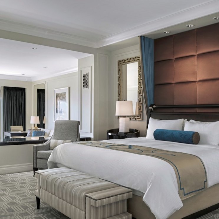 - 81-90 qm, Suite, Premium, Blick auf den Strip oder den Pool , optisch getrennter Wohn-/Schlafraum, Doppelbett (Kingsize), Dusche, Badewanne, WC, Bademantel, Haartrockner, Klimaanlage, Minibar kostenpflichtig, Safe, 2 TVs, DVD-Player
