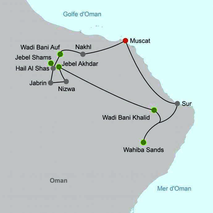 Die Wahiba Sands sind für ihre goldenen Dünen bekannt, ideal für Wüstencamps und Kameltouren. Das Rub al-Khali, die grösste Sandwüste der Welt, beeindruckt mit endloser Weite. In den Bergen bietet der Jebel Shams, der „Grand Canyon des Oman“, spektakuläre Ausblicke, während der Jebel Akhdar mit fruchtbaren Terrassen und kühlerem Klima überrascht.
