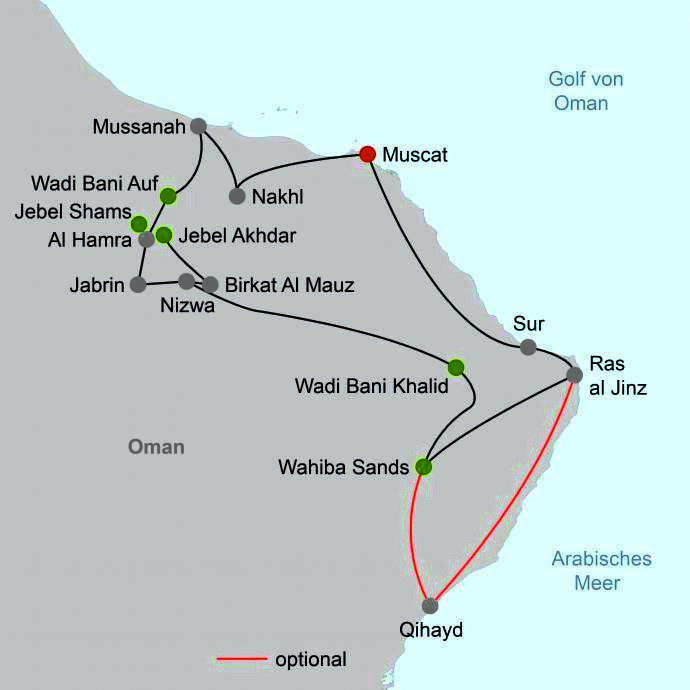 Highlights sind die imposante Sultan-Qabus-Moschee in Maskat, das historische Nizwa Fort, die dramatische Landschaft des Wadi Shab und die Dünen der Wahiba Sands. Die Bahla-Festung (UNESCO-Weltkulturerbe) und die Fjorde von Musandam bieten unvergessliche Einblicke in die Vielfalt des Landes.