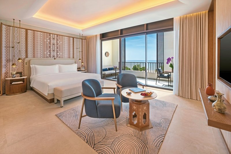 Die Zimmer: Die 103 Zimmer und 47 Suiten strahlen unaufdringlichen Luxus mit omanisch inspirierten Elementen aus, die Authentizität und Charme verkörpern. Die Zimmer bringen Wärme, Komfort und Raffinesse an die Küste von Muscat und bieten einige der faszinierendsten Ausblicke auf den Golf von Oman und das majestätische Hajar-Gebirge.