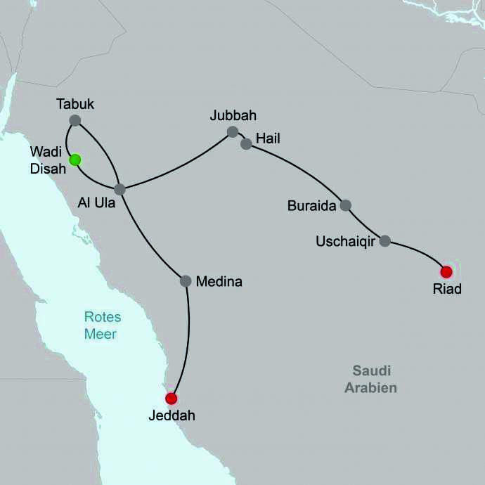 Ist die wichtigste Hafenstadt Saudi Arabiens am Roten Meer und gilt auch als das Tor zur heiligen Stadt Mekka, dem religiösen Zentrum des Islam. Die malerische Altstadt Al Balad ist UNESCO-Weltkulturerbe und eines der stimmungsvollsten Viertel des Königreichs. Ein Bummel durch die engen Gassen zwischen alten Kaufmannshäusern mit wunderschönen Holzfenstern und Balkonen ist ein Muss. Die 4,2 km lange Uferpromenade mit Badebuchten, Restaurants und üppig bepflanzten Spazier- und Radwegen lädt zu abendlichen Spaziergängen ein, um über dem türkisfarbenen Roten Meer wunderschöne Sonnenuntergänge zu bewundern. Ein weiteres Highlight ist die schwimmende Moschee Al Rahma, die an der Nordspitze von Jeddahs Uferpromenade zu finden ist. Ein Stopp in der „Red Sea Mall“, einem der größten Einkaufszentren an der Westküste des Königreichs mit einer Grundfläche von 242.000 m², ist ebenfalls zu empfehlen.