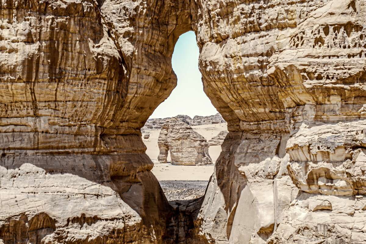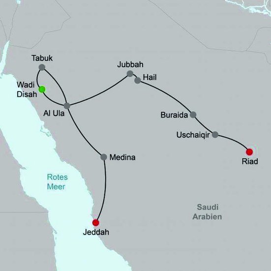 (Sonntag) Am Morgen Inlandsflug von Riad nach Tabuk. Nach Ankunft erwartet Sie eine unvergessliche Wüstentour in den wunderschönen Bergen des Bajda-Gebirges durch enge Passagen und rote Dünen. Sie sehen den Schiffsfelsen mit über 1.300 Jahre alten Inschriften, den Great Arch und den Jubb Canyon, ein spektakulärer Ort, um einen Spaziergang zwischen Sandfelsen mitten in der Wüste zu unternehmen. Eine Nacht in Tabuk im Swiss Inn (gehobene Mittelklasse, Landeskategorie: 4 Sterne). (Frühstück, Mittagessen)