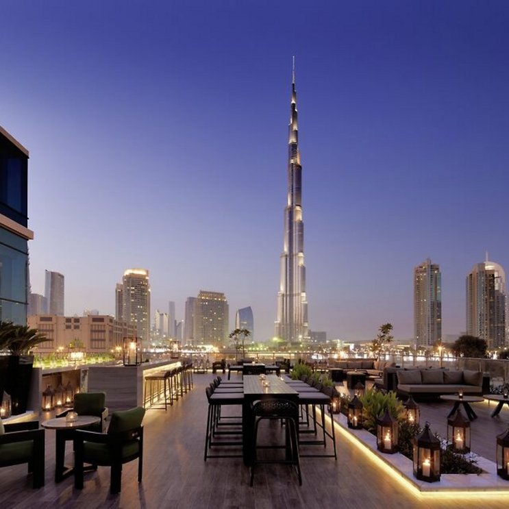 - Außenlounge „Treehouse” mit Panoramablick auf den Burj Khalifa