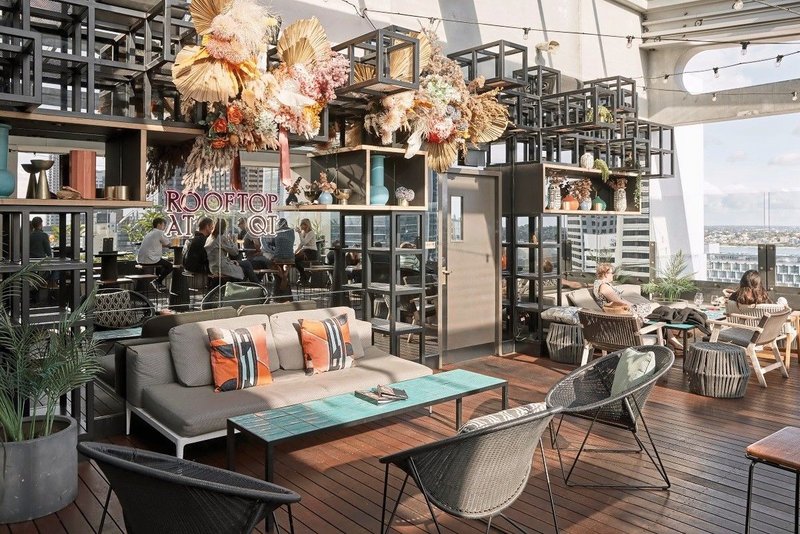 Rooftop-Bar mit Blick auf die Skyline von Perth