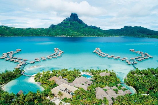 Ihr Sehnsuchtsort im Süd-Pazifik: wohnen in luxuriösem Ambiente, erfrischen im Infinity-Pool, abtauchen in der privaten Lagune. Wunderschön ist der Sonnenuntergang hinter dem Berg Otemanu, z.B. von der Otemanu Bar aus.