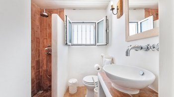 Und direkt unterhalb dieser großen Veranda befindet sich eine gepflasterte Sonnenterrasse, die teilweise in Palmenschatten liegt und einen kühlen Infinity-Pool umgibt. Ein abfallender, gestufter und geschützter Weg führt vom Sandy Bay Cottage zum riesigen, weichen Sandstrand, der nur 300 M darunter liegt. Geschäfte und Restaurants in Ferragudo sind zu Fuß in 1,2 km Entfernung und Tennis, Golf und Wassersport sind im Umkreis von 4 km zu erreichen.