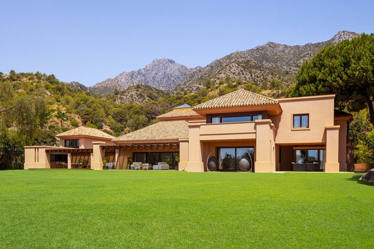Fast versteckt in ruhigen und tropischen Gärten, wo hoch aufragende Palmen aus gepflegten Rasenflächen emporragen, bringt diese spektakuläre Familienvilla in Andalusien mehr als einen Hauch von Bali nach Puerto Banus.