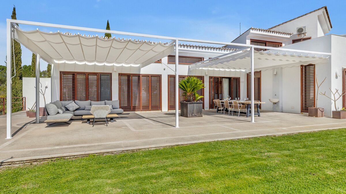 The villa’s design celebrates the light and landscape of Andalucia. Inside, the vast open-plan living space is defined by soaring ceilings, eclectic artwork, and full-length glass doors that dissolve the boundary between the interior and the sun-drenched patios. Whether you are retreating to a quiet library nook with a book or hosting a movie night with the cinema projector, the house has a relaxed, easygoing feel that makes everyone feel right at home.