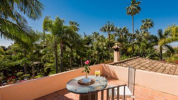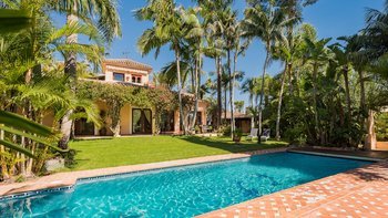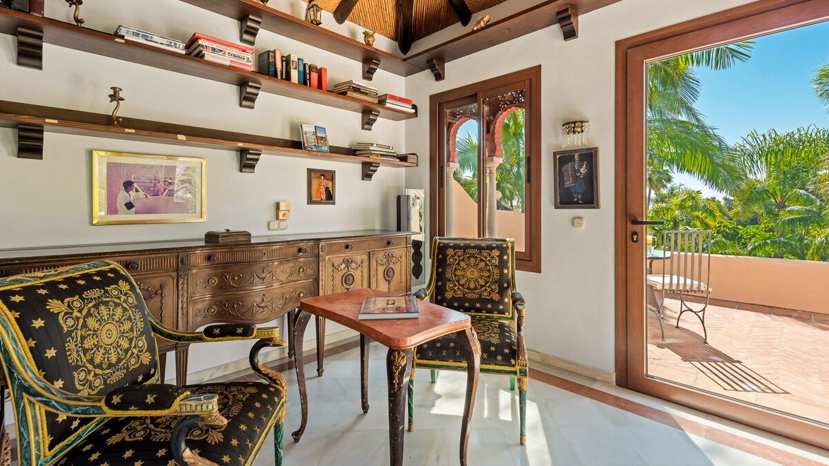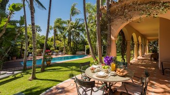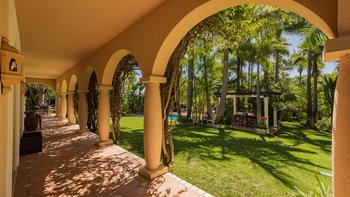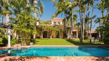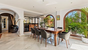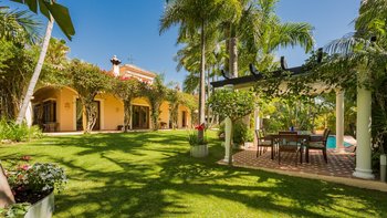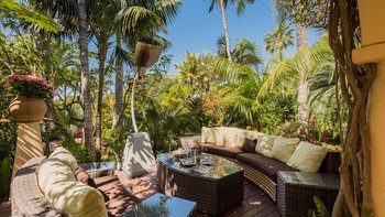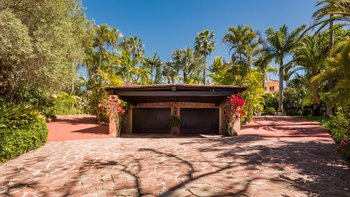 Fast versteckt in ruhigen und tropischen Gärten, wo hoch aufragende Palmen aus gepflegten Rasenflächen emporragen, bringt diese spektakuläre Familienvilla in Andalusien mehr als einen Hauch von Bali nach Puerto Banus.