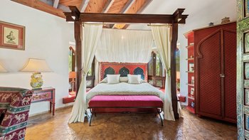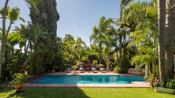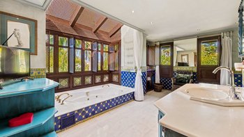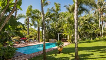 Die Anlage des Rodeo Alto ist ein fantastisches Zeugnis seines preisgekrönten Gärtners und umfasst mehrere Sitz- und Essbereiche, einen Swimmingpool, eine Sonnenterrasse und eine Pergola am Pool und einen Unterhaltungsbereich im thailändischen Stil mit Küchenzeile, Bar und stilvollem Essen, der über eine Holzbrücke über einen ruhigen Teich erreichbar ist. Dessen Haus selbst ist nicht weniger beeindruckend, seine glamourösen, übergroßen Zimmer sind in einer eklektischen Mischung aus Stilrichtungen eingerichtet, die von coolem und modernem Chic bis hin zu ländlicher Eleganz und maurischer Lebendigkeit reichen.