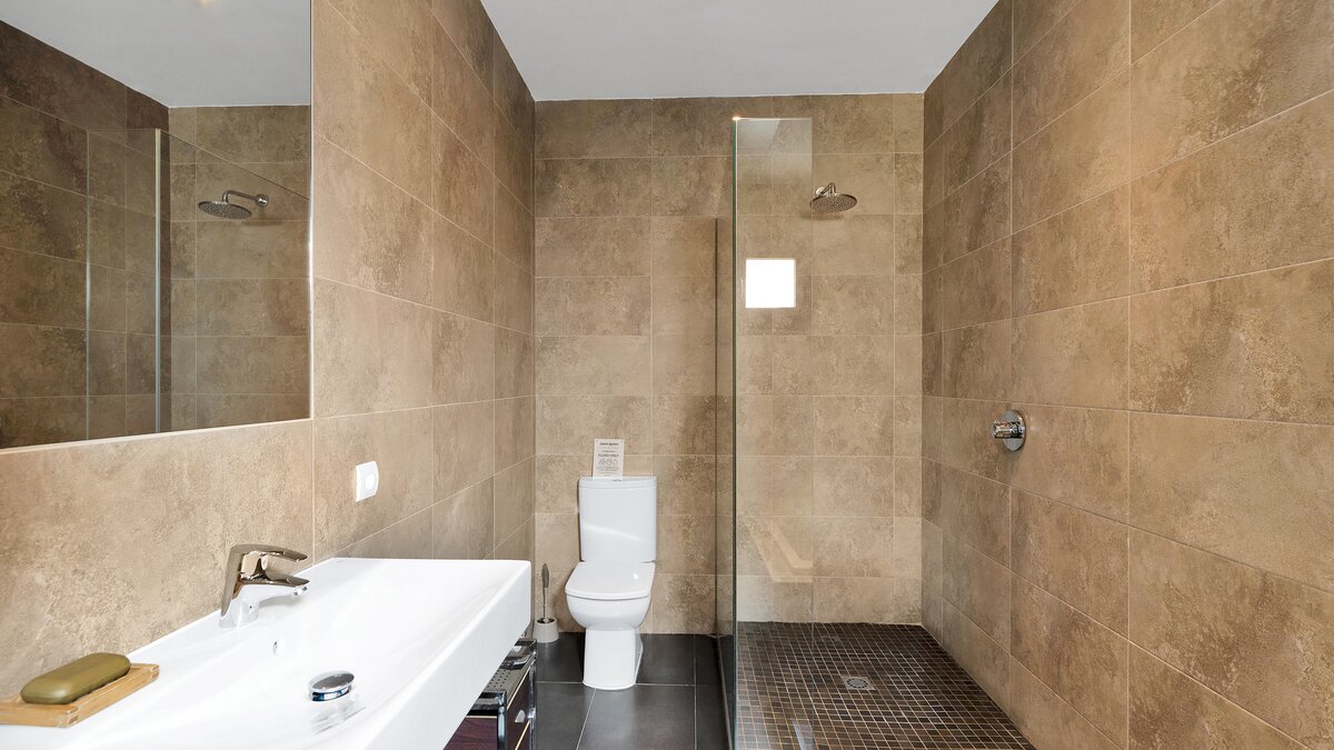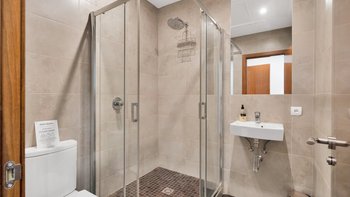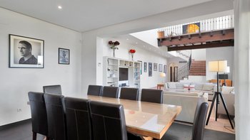 Der Eingang zur Villa befindet sich im ersten Stock, mit einer Treppe, die zum Wohnbereich im Erdgeschoss führt, mit einem großen offenen Wohnzimmer, einer Küche und einem separaten Essbereich, die alle zu einer überdachten Essterrasse führen. Auf jeder Etage befinden sich zwei Schlafzimmer.