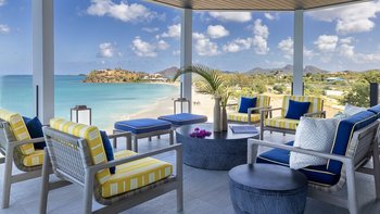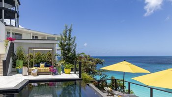 Diese charmante Villa am Meer mit vier Schlafzimmern bietet einen Panoramablick auf das Karibische Meer bis zum Horizont und den Ffryes Strand darunter.