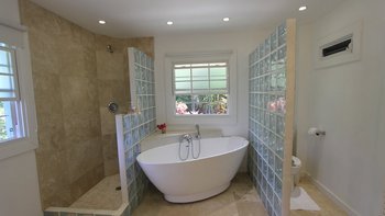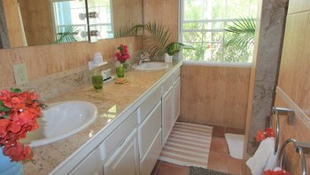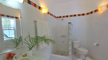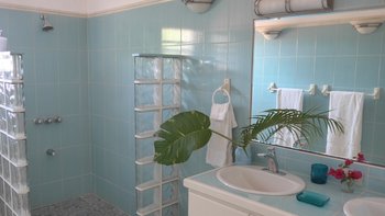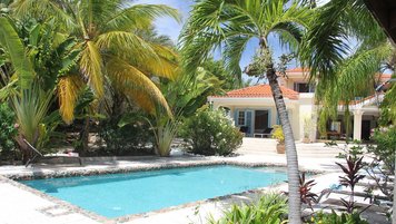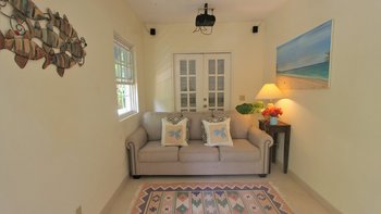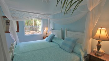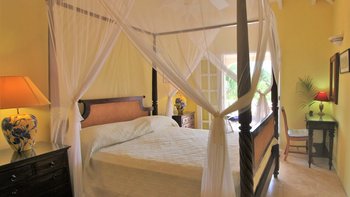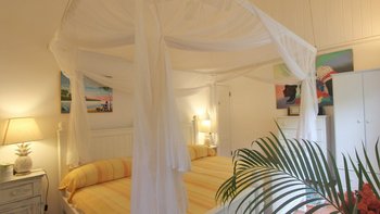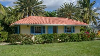 Zwischen Palmen thront ein charmantes Häuschen auf dem Grundstück, Bildkarte gelb gemalt mit blauen Fensterläden. Ein Schlafzimmer mit Bad und Dusche en suite ist hier verschachtelt.