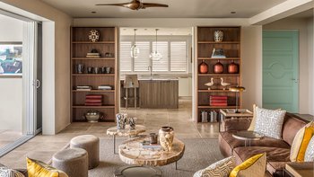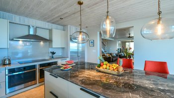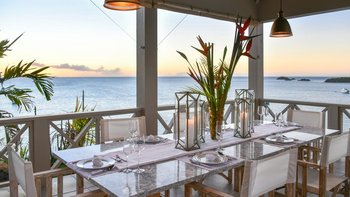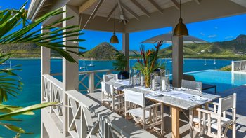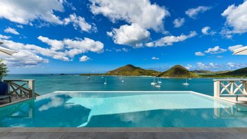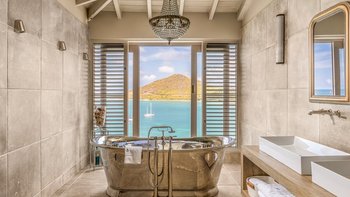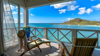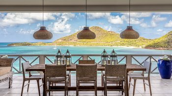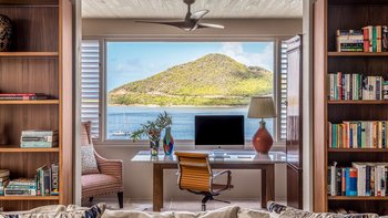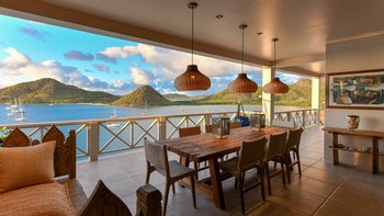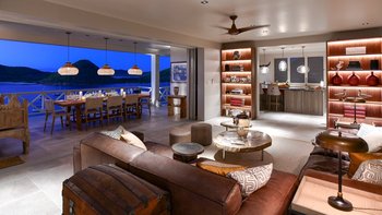 Im ersten Stock steht ein offener Grundriss Wohn-, Küchen- und Essbereich im Mittelpunkt. Der Wohnbereich ist auf höchstem Niveau eingerichtet, die Küche ist modern und voll ausgestattet, und der Essbereich im Freien bietet eine unglaubliche malerische Aussicht auf das Karibische Meer und die Umgebung von Antiguan. Falttüren trennen den Wohn- und Essbereich, sodass die Gäste die Möglichkeit haben, die Räume getrennt zu halten oder einen nahtlosen Lebensstil im Innen- und Außenbereich zu genießen. Ein Medienraum und ein Arbeitszimmer befinden sich ebenfalls auf dieser Etage mit Blick auf den Rommee Harbour.