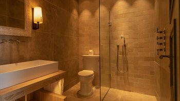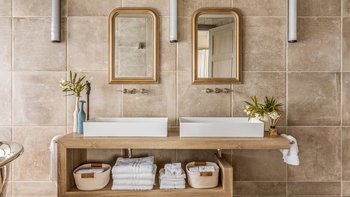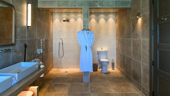 Im Erdgeschoss befinden sich zwei Doppelschlafzimmer mit Dusche en suite und Ankleideräume, beide mit viel Licht und bezauberndem Meerblick. Im unteren Erdgeschoss gibt es ein weiteres Doppelschlafzimmer mit eigenem Bad und einen Fitnessraum mit Dusche, ideal für Gäste, die sich im Urlaub fit halten möchten.