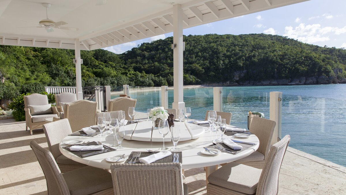 Diese opulente Villa mit fünf Schlafzimmern befindet sich direkt an der Spitze von Antigua und bietet Panoramablick auf das Meer und exquisites Design.