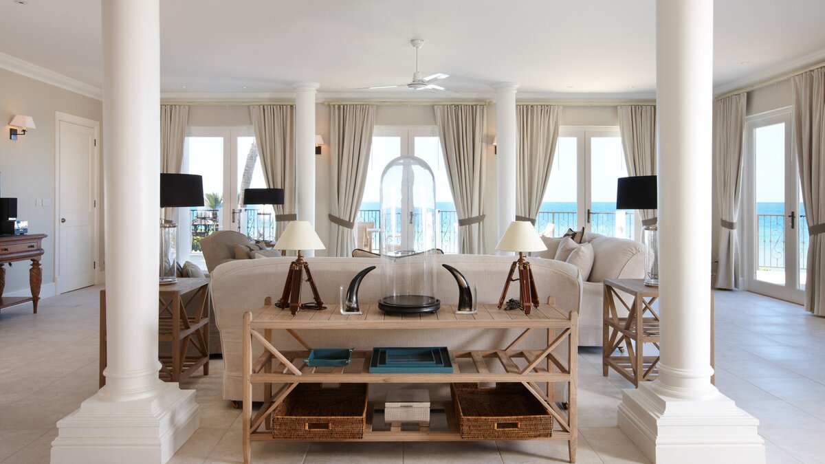 Im Obergeschoss befinden sich zwei weitere Doppel-Kingsize-Schlafzimmer mit Bad en Suite. Mit vier Himmelbetten, einem neutralen, beruhigenden Interieur und französischen Türen, die auf einen Sitzbalkon mit Meerblick führen, sind diese Zimmer der Inbegriff von Luxus.