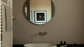 Outside, a shaded pergola invites alfresco dining, while the infinity pool opens onto sweeping views of olive groves, orchards, and dry-stone walls stretching across the countryside. The low-impact garden, designed by award-winning Studio Paz, combines native plants and sculptural stone paths, reflecting the rhythms of the land.
