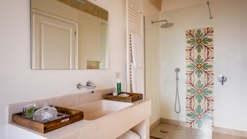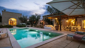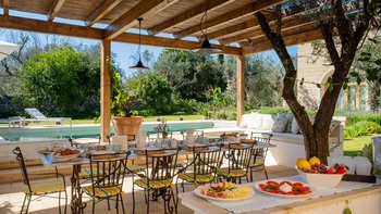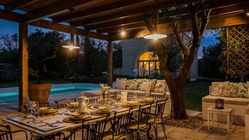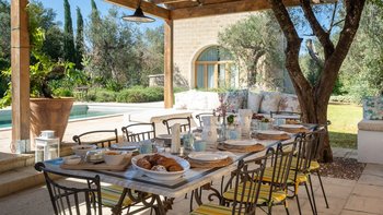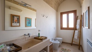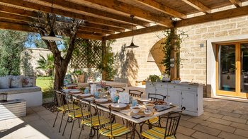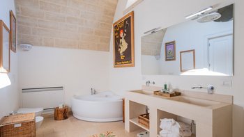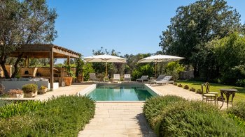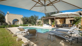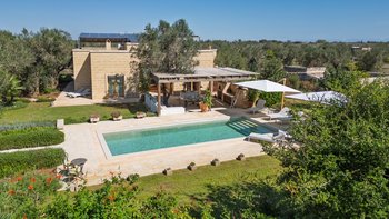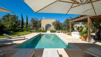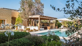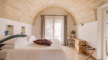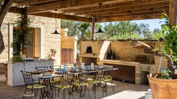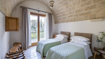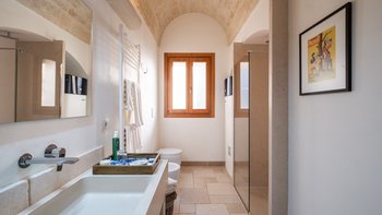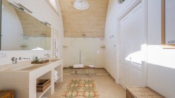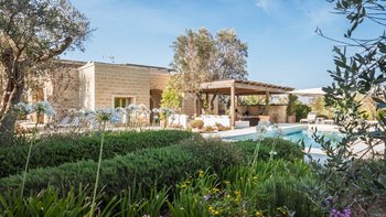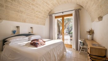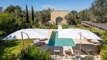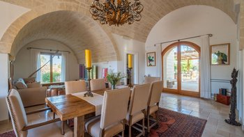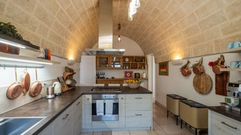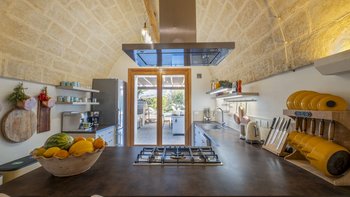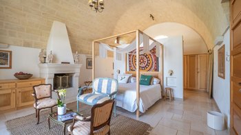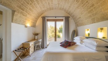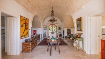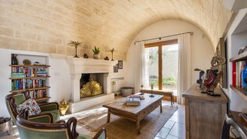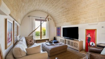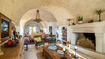 Für eine wirklich entspannende Zeit auf dem Land wäre eine geräumigere, elegante Villa schwer zu finden. Ein perfekter Rückzugsort von der belebten Küste, Masseria delle Perle verfügt über weitläufige Gärten, Terrassen im Freien und einen Pool, in dem man richtig schwimmen kann, ergänzt durch Interieurs mit bequemen Sofas und einem großen offenen Kamin in der Bibliothek – cum Wohnzimmer. Dieser Villa ist ein ziemlich erwachsenes Erstattung eine sehr moderne Inneneinrichtung unter den Gewölbedecken geschaffen.