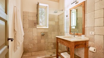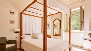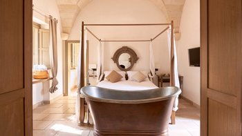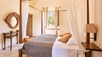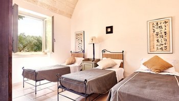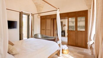 Masseria di Stelle ist ein idealer Ort, um die Schönheiten Apuliens zu erkunden, sowohl seine charmanten Städte wie Otranto und Lecce und auch die atemberaubenden Sandstrände der Küste. Deren Anwesen ist sehr komfortabel und ideal für Familien, mit einem luxuriösen ländlichen Ambiente im Inneren. Denen Unterkünfte im Haupthaus befinden sich alle auf einer Etage und verfügen über eine gut ausgestattete Küche und einen Frühstücksbereich und ein helles und geräumiges Wohn-/Esszimmer mit offenem Kamin. Deren schöne Hauptschlafzimmer verfügt über ein Himmelbett und ein eigenes Bad mit ebenerdiger Dusche. Es gibt zwei weitere Schlafzimmer im Haupthaus, eines mit einem Himmelbett und einem eigenen Duschbad, das andere ist ein zusätzliches Zimmer mit zwei Einzelbetten, das mit dem Hauptschlafzimmer verbunden ist.