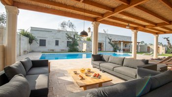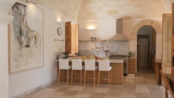 Diese moderne Luxusvilla in Apulien wurde von meisterhaften Handwerkern mit viel Liebe zum Detail erbaut, von den Gewölbedecken bis zu den handgeschnitzten Sandsteinmauern. Sie ist eine moderne Luxusvilla in Apulien, die den Grundriss und die schlichte Eleganz der traditionellen Bauernhäuser der Region widerspiegelt. Riesige Holztüren füllen das gewölbte Tor in den Innenhof, der groß genug für eine Partie Badminton ist und einen Pizzaofen, einen Grill und einen großen Esstisch unter Pergola-Schatten beherbergt. Eine Außentreppe führt zu einer sonnenverwöhnten Dachterrasse, ein gewölbter Portikus schützt die Türen zu drei Schlafzimmern mit Bad und Fensterläden verbinden den Außenbereich mit einem offenen Wohnzimmer und einer Küche, wo Edelstahl und zeitgenössische Kunst die Einrichtung im Landhausstil ergänzen. Ein Gästeanbau bietet zwei weitere Schlafzimmer, während zusätzlicher Außenbereich im ummauerten Garten liegt, der einen 15 Meter langen Pool mit Blick auf die Olivenhaine mit einem schönen Mittagessen im Freien umgibt. Zusätzlich zum Gästeanbau gibt es eine neue Gartensuite mit einem geräumigen Schlafzimmer mit Doppelbett, das zu einer privaten Terrasse führt. Zu den weiteren Neuerungen gehören eine Pool-Loggia mit weichen Sitzgelegenheiten und Platz für Sonnenliegen und ist auch ein großartiger Ort für Freiluftkino.