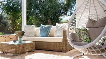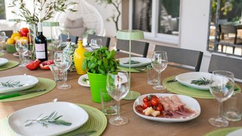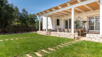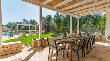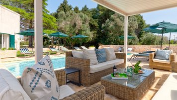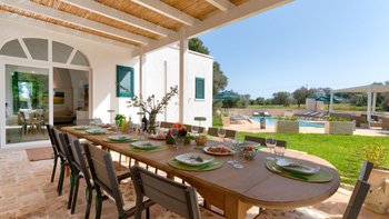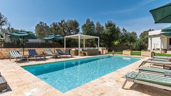 Draußen kommt die Villa voll zur Geltung. Eine weitläufige, schattige Terrasse mit Blick auf eine gepflegte Rasenfläche und den einladenden, beheizbaren Pool – der Mittelpunkt für lange, sonnige Tage. Der Poolbereich ist gut ausgestattet mit bequemen Liegen und Sonnenschirmen zum Entspannen, während die Kinder den Spielplatz unter den Pinien mit angrenzendem Trampolin und Tischtennis spielen können. Zu den jüngsten Ergänzungen gehören ein Mehrzweck-Spielplatz und eine ruhige Yoga-Shala, was die Masseria Annabella sowohl für aktive Familien als auch für Damen und Herren, die Entspannung und Wohlbefinden suchen, attraktiv macht.