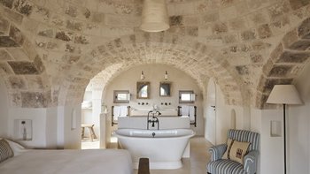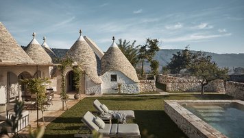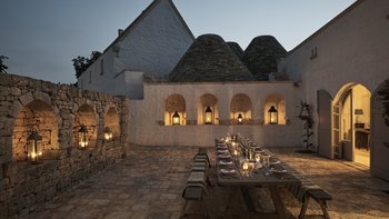 Im Außenbereich werden die drei Hektar großen privaten, ummauerten Gärten der Masseria von aromatischen Pflanzen begleitet, die den Raum mit einer reichen Vielfalt von Farben und Düften verschönern, die in ganz Italien zu finden sind. Das Zusammenspiel dieser Elemente hebt das Ambiente der weitläufigen Speiseräume im Freien hervor, die für Gruppen von 20 Gästen geeignet sind und ihnen ein Gefühl von Ruhe und Raffinesse vermitteln. Der beeindruckende beheizbare Pool der Villa ist eine großartige Möglichkeit, sich nach einem Abendessen zu entspannen, und die Villa liegt in unmittelbarer Nähe zur Küste. Ganz in der Nähe können die Gäste in einem der drei Restaurants in Cocolicchio ein authentisches italienisches Gericht probieren und zwischen verschiedenen gastronomischen Einrichtungen in der berühmten Stadt Alberobello wählen, die für Hunderte von Puten bekannt sind. Diese sind repräsentativ für die Architektur der Region, die seit dem 14. Jahrhundert beliebt ist.