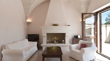 Mit modernem Dekor, hellen Steinwänden, Marmorböden und herrlichen Gewölbedecken liegt dieses wunderschöne Haus in ruhiger Abgeschiedenheit Privat nach, ländlichen Hektar und strahlt einen Hauch kühle, ruhige Entspannung aus. Ein geschlossener Innenhof an der Vorderseite der Villa hat ein fast maurisches Flair, mit sanfter Beleuchtung für laue Abende, die die anmutige Architektur der Masseria hervorheben. Ein größerer Innenhof im hinteren Bereich beherbergt einen ungewöhnlich großen Swimmingpool mit Sonnenschirm für einen Sitzbereich am Pool und eine Pergola für Mahlzeiten im Freien. Französische Türen führen von hier aus in den Wohnbereich, wo ein luftiges, cremeweißes Wohnzimmer zur Essküche hin offen ist, deren schlankes Design durch ländliche Stoffe aufgeweicht wird. Und in einer Aufteilung, die zwei Familien mehr Privatsphäre bieten würde, sind die Zimmer vom Kreuzgang aus zugänglich, zwei im Mittelteil, zwei im Seitenflügel, und alle klimatisiert, elegant und übersichtlich.