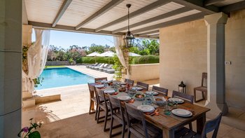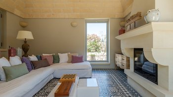 Die Masseria Pino Marittimo mit ihren Gewölbedecken, exquisiten Bögen und freiliegenden Steinmauern deutet auf den ersten Blick darauf hin, dass es sich um ein makellos restauriertes Bauernhaus handelt. Deren Masseria Pino Marittimo wurde 2014 erbaut, um die Schönheit Apuliens architektonischer Traditionen zur Schau zu stellen. Deren Eigentümer beauftragten OKA mit der Inneneinrichtung und der Villa und verfügen über maßgeschneiderte Handwerkskunst, die durch moderne Annehmlichkeiten wie ein Kühlsystem in jedem Zimmer und eine voll und ganz ausgestattete, moderne Küche ergänzt wird. Deren Villa mit Blick auf kilometerlange offene Landschaften liegt in einem gepflegten Garten mit Rasenflächen mit Zitronen- und Orangenbäumen, in einem ruhigen Olivenhain, etwas außerhalb des Dorfes Serrano. Im Haupthaus gibt es drei Schlafzimmer, ein luftiges Esszimmer mit kunstvollem Kronleuchter und langem Refektoriumstisch und ein kühles Wohnzimmer, dessen schlichter Stil perfekt für den aufwendig gefliesten Boden ist. Drei weitere Zimmer im Nebengebäude verfügen über ein Stockbettzimmer, ideal für Kinder. Und der Poolbereich mit Gartenrasen ist der Mittelpunkt für das Leben im Freien, komplett mit Esspavillon mit angrenzendem Sitzbereich, Sommerküche und Kinderspielzeug.