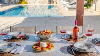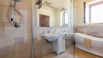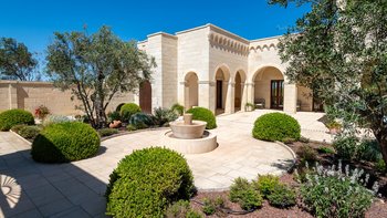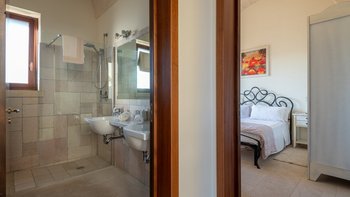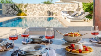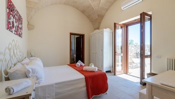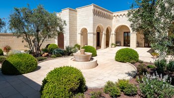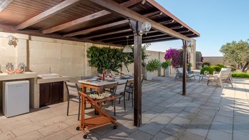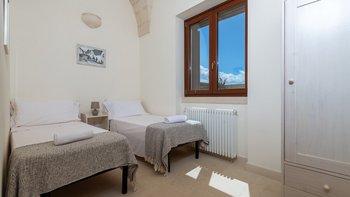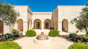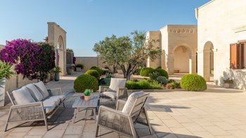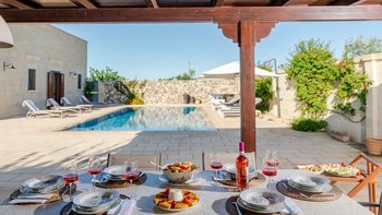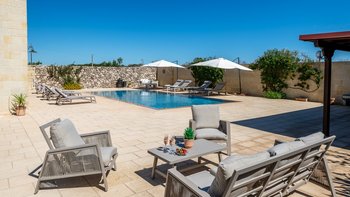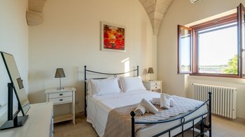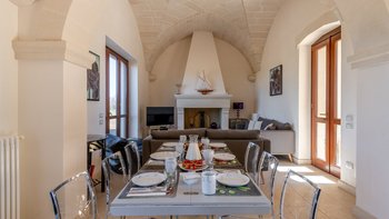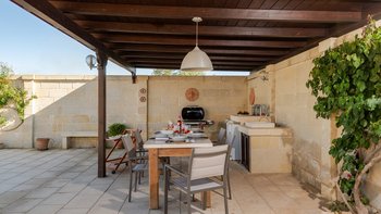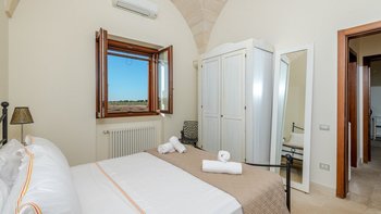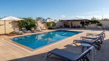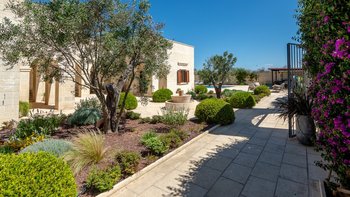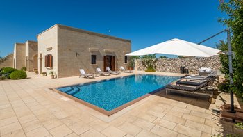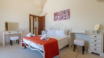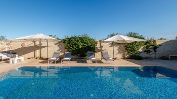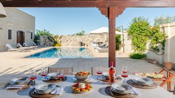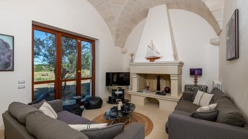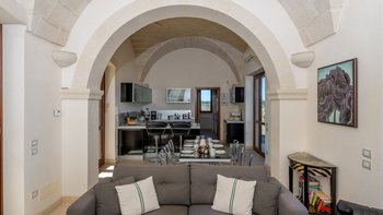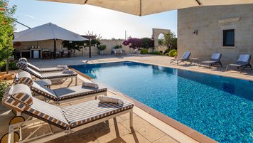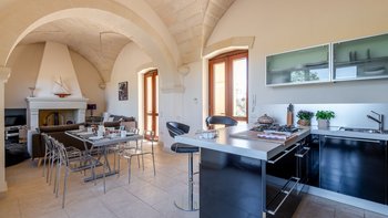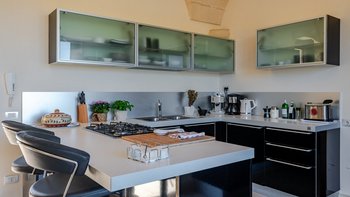 Mit Olivenhainen, soweit das Auge reicht, und einer Dachterrasse mit klarem Blick auf die albanischen Berge genießt die Masseria Violetta eine wirklich ruhige Lage. Geschäfte und Restaurants in Cannole sind nur 2 km entfernt und Martano und Otranto sind beide leicht zu erreichen. Der im Stil der Region aus hellem Stein erbaute „U“-förmige Haus steht in einem lockeren Innenhof mit Bogengängen, die zu den Zimmern führen, einer Steintreppe zum Dach und einem Springbrunnen, der sanft in der Sonne plätschert. Innerhalb der Villa krönen hohe Gewölbedecken stilvolle Zimmer in minimalistischem Monochrom, die mit Schmiedeeisen, Chrom und Glas eingerichtet sind und mit Klimaanlage, WLAN und modernen Geräten ausgestattet sind. Lichtdurchflutet von zwei Türen zur Terrasse und zu Obstbäumen, bildet der Sockel des „U“ eine offene Küche mit Frühstückstheke, einem sehr modernen Essbereich und einem eindrucksvollen Wohnzimmer. Es gibt zwei Doppelschlafzimmer in einem der Flügelund im anderen ein Zweibettzimmer und die Master-Suite, die sich zur Poolterrasse mit ihrem beeindruckenden Bad öffnet. Des Wohnzimmers im Freien konzentriert sich auf einen Pool mit Nachtbeleuchtung, der sich auf einer ummauerten und gepflasterten Terrasse befindet, mit einer Ess-Pergola, einem Grill, einem Kühlschrank und einem Bereich für die Zubereitung von Speisen.