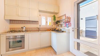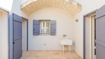 • Küchenöffnung zum internen Servicehof mit Spüle und Außendusche