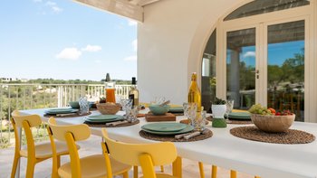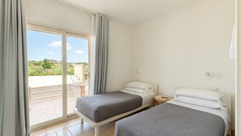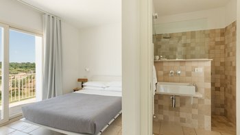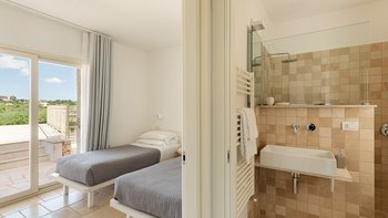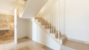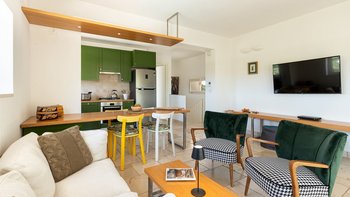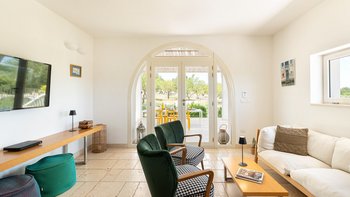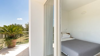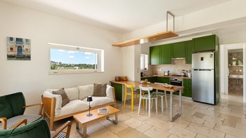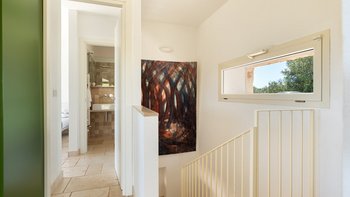 Die moderne Villa San Rocco bietet Platz für vier Personen, ist aber auch ideal als romantischer Rückzugsort für zwei Personen. Sie verfügt über eine moderne Einrichtung und einen aufgeräumten Stil. Von außen öffnet sich die Auffahrt in einen weitläufigen Garten mit Olivenbäumen. Von hier aus haben die Gäste einen komfortablen Panoramasitzbereich und weitreichenden Blick über die Landschaft. Im Inneren befindet sich ein offener Wohnbereich mit Sofa, zwei Stühlen und einer modernen und Einbauküche. Deren Innenräume sind farbenfroh und es gibt zwei Schlafzimmer, ein Doppel- und Zweibettzimmer, mit geräumigen Duschbädern. Deren Schlafzimmer mit Doppelbett befindet sich im Erdgeschoss und öffnet sich und zur oberen Panoramaterrasse. Eine Treppe führt hinunter in die untere Etage, wo sich ein luftiges Zweibettschlafzimmer mit Zugang zur Poolterrasse befindet. Deren Eingangstür führt zu einem möblierten Essbereich, der von einem gut beleuchteten Portikus mit Blick auf die Gärten und den Sitzbereich im Freien beschattet wird.