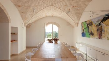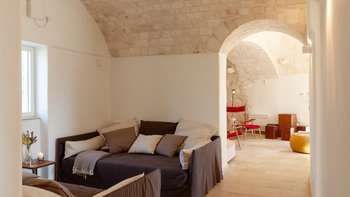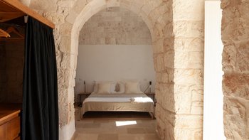 Die Innenräume verbinden traditionellen Charakter mit zeitgemäßem Design. Gewölbte Steindecken und freiliegende Wände schaffen Atmosphäre, während moderne Möbel für Komfort sorgen.