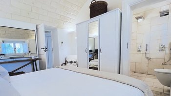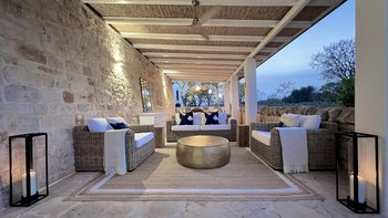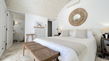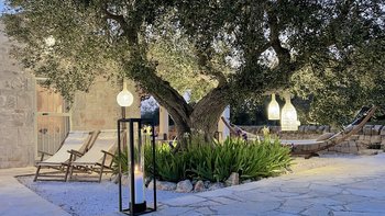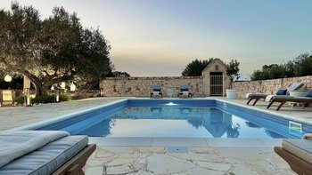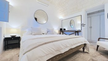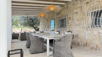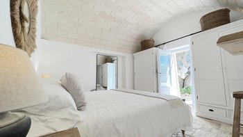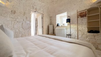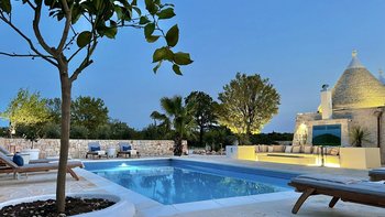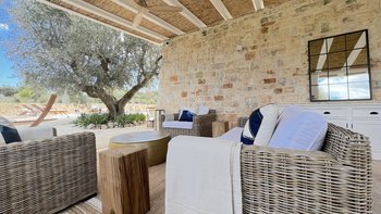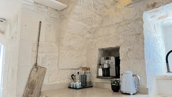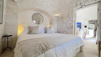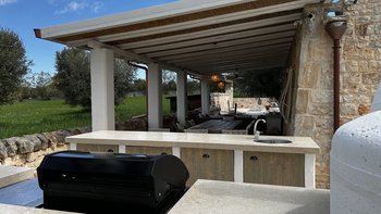 Trulli Linda ist eine wunderschöne und moderne Villa in der Nähe von Cisternino und Locorotondo. Aller Zimmer befinden sich auf einer Etage. Im Inneren befinden sich das einzigartige Wohnzimmer, ein großer Trullo-Kegelraum mit gemütlichen Sitzgelegenheiten und ein Smart-TV. Deren voll ausgestattete Küche verfügt über zwei Trullo-Kegel, die elegant mit polierten Steinarbeitsplatten und diversen Smeg-Utensilien eingerichtet sind. Der Speisesaal ist der perfekte Ort, um sich nach einem erlebnisreichen Tag zu entspannen und zu plaudern, komplett mit einem gemütlichen Holzfeuer und Accessoires für die Zubereitung von Cocktails. Der schöne Flur mit einer authentischen Steinfassdecke verbindet alle Zimmer mit den überdachten Terrassenbereichen. Deren Villa verfügt über drei helle und luftige Schlafzimmer. Zwei Doppelschlafzimmer sind stilvoll mit steinernen Tonnengewölbedecken und einem eigenen Bad mit zwei Regenduschen und Wasserfällen ausgestattet. Dessen drittes Schlafzimmer, ein Zweibett, ist genauso schön und kann auch in ein Doppelzimmer umgewandelt werden.