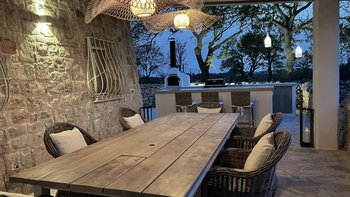 Das Äußere dieser Immobilie ist genauso atemberaubend; Gehen Sie hinaus auf die Terrasse, wo Sie eine wunderbare Außenküche mit einer Servierinsel, einen Gasgrill mit drei Brennern mit Grill und Plancha und einen großen eingebauten Holzofen entdecken können, wo die Gäste authentische italienische Pizza und Brot backen können. Dessen überdachte Terrasse verfügt über einen maßgefertigten „Prosecco-Esstisch“ mit zwei integrierten Eisfächern, Pendelleuchten und einem großen Anrichtebrett. Es gibt auch einen gepolsterten Rattan-Loungebereich mit Apple Home Pod, Holzdeckenventilator und Blick auf den Pool. Denen Gäste werden auch den Feuertisch genießen, der perfekte Ort, um einen Aperitivo am Pool zu genießen. Die Villa befindet sich in der Nähe einer Auswahl an Geschäften und ausgezeichneten Restaurants in Locorotondo oder Cisternino, beide 5 km entfernt.