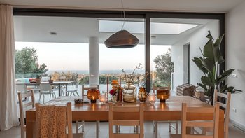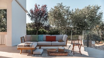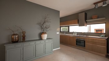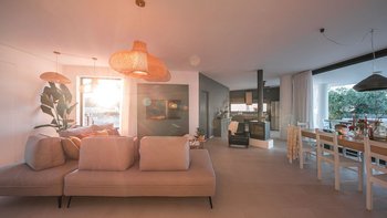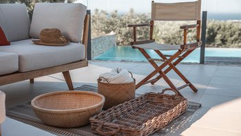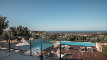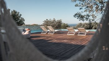 Im Freien können Sie Ihren Abendessen im Freien auf einer weitläufigen Veranda mit Blick auf das Meer genießen. Entspannen Sie die Sonnenstrahlen auf der hölzernen Sonnenterrasse am großen Pool oder genießen Sie den Sonnenuntergang von der Außenlounge aus. Eine große Rasenfläche und zwei Hektar Land umgeben das Anwesen mit verschiedenen Obstbäumen.