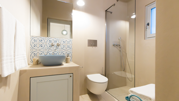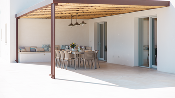 Im Zentrum der Villa befinden sich eine helle, offene Küche und ein Wohnbereich mit Zugang zu einer überdachten Terrasse, die Innen- und Außenbereiche miteinander verbindet. Natürliche Materialien und klare Linien schaffen eine entspannte, zurückhaltende Atmosphäre, während das Wohnzimmer einen komfortablen Ort zum Entspannen bietet.