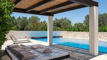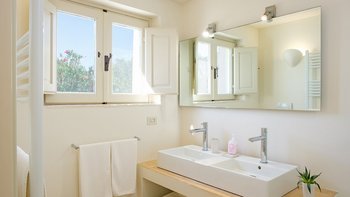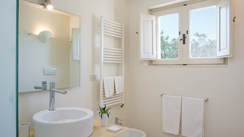 Villa Zenzero ist eine wunderschöne Villa im schönen Apulien, mit modernen und hellen Wohnräumen und einem beheizbaren, geschlossenen Pool. Eine von Lavendel und Rosmarin gesäumte Auffahrt führt hinauf zur Vorderseite der Villa, dem Haupteingang, der sanft unter kletternden Glyzinien beschattet wird. Im Inneren entdecken die Gäste traditionelle Steindecken und Torbögen, wobei jedes Zimmer in einem modernen und hellen Stil eingerichtet ist. Der offene Grundriss der Küche, der Ess- und Sitzbereich im Innenbereich ist geräumig und komplett mit einem schönen Glastisch mit Stühlen. Direkt neben der Küche bietet eine gemütliche Lobby mit Sofas und einem Fernseher den perfekten Ort, um sich am Abend zu entspannen. Am Ende des Wohnzimmers der Villa befinden sich zwei Doppelschlafzimmer (Super-Kingsize) mit jeweils eigenem Duschbad und Zugang zum Garten. Weitere Schlafzimmer befinden sich am anderen Ende der Villa, darunter drei Zweibettzimmer mit viel Platz. Diese verfügen über ein Gemeinschaftsbad mit Dusche, zwei Waschbecken und freistehender Badewanne.