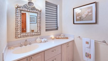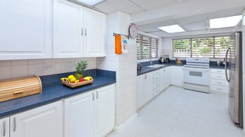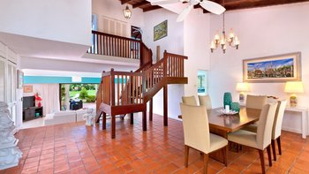 Drei Stufen vom Essbereich entfernt, befindet sich ein offenes Wohnzimmer mit großen Sofas, einer gemütlichen Bar und einem kleinen Frühstücksbereich und öffnet sich auf eine schattige Terrasse, die von Muschellaternen beleuchtet wird und auf die Rasenflächen am Meer trifft. Des Cottage, nur ein paar Meter über dem Gras, ist eine schöne offene Anordnung von Kingsize-Schlafzimmer, Wohnzimmer und Küchenzeile. Neben der historischen St. James Kirche liegt die Villa 800 m vom lebhaften Holetown und einen kurzen Spaziergang entlang der Promenade vom Schnorcheln im Folkestone Marine Park entfernt.
