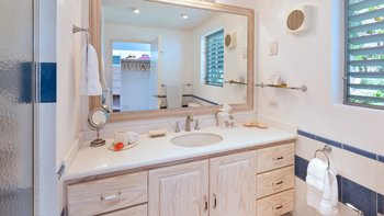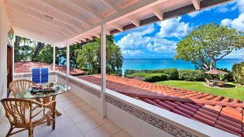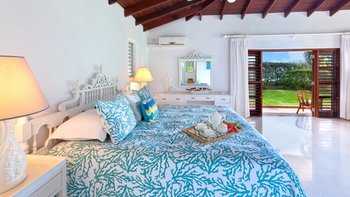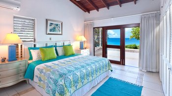 Diese helle und einladende Villa ist privat von alten Bäumen abgeschirmt, mit Rasenflächen und Terrassen für das Leben im Freien und dem klaren Wasser der Karibik, das eine weiße Sandbucht am Fuße des Gartens umspült, ein vollkommen charmanter Ort zum Entspannen. Im gesamten Haus vermischen sich Dekor und Möbel knackig weißes mit lebhaften Stoffen in Rot- und Aquatönen, Deckenventilatoren verstärken die kühlende Meeresbrise und WLAN steht zur Verfügung, um mit der realen Welt in Berührung zu kommen. Der Eingang zum Haupthaus führt in das doppelte Esszimmer, von dem aus eine offene Treppe zu zwei klimatisierten Schlafzimmern mit eigenem Bad im Obergeschoss führt, jedes mit einer Dachsparrendecke und Türen zu einem gemeinsamen Balkon mit Meerblick.