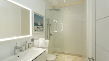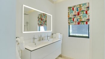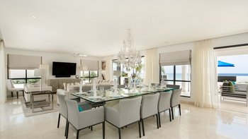 Die Unterkunft erstreckt sich über zwei geräumige Etagen, wobei das Erdgeschoss ideal für einen offenen Grundriss des Wohnens konzipiert ist. Der große Wohnbereich mit kühlen Marmorfliesen und opulenten Kronleuchtern ist in neutralen Farbtönen gehalten und bietet Raum für Entspannung im Innenbereich, einen großen Esstisch aus Glas und eine voll ausgestattete Küche mit Frühstückstheke. Große Glastüren führen auf die riesige Terrasse. Denen Gäste können sich auf bequemen Sitzgelegenheiten im Schatten entspannen, am Pool entspannen oder im Freien speisen, während sie den atemberaubenden Meerblick bewundern.