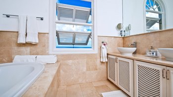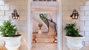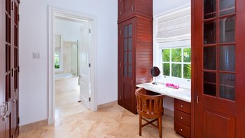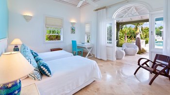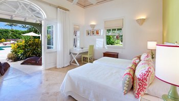 Dieses charmante, weiß gemauerte Anwesen hebt sich von üppigem Grün und wiegenden Palmen im schönen St. James hervor. Durch den großen, gewölbten Eingang gelangen Sie in einen hellen und eleganten Wohnbereich mit gemütlichen Sofas, Marmorfliesen und einem großen Flügel. Dessen Familienzimmer ist mit einem Fernseher und bequemen Sitzgelegenheiten für die ganze Familie ausgestattet und bietet den perfekten Ort zum Entspannen nach einem ereignisreichen Tag. Deren voll ausgestattete Küche ist der perfekte Ort für Ihren privaten Kochservice, um ein köstliches Essen zuzubereiten. Dessen Öffnung führt direkt auf die herrliche Terrasse mit Blick auf den Pool. Im Erdgeschoss befindet sich auch ein geräumiges Schlafzimmer mit Doppelbett und Bad en suite. Wenn man die Wendeltreppe hinaufgeht, gelangt man in den ersten Stock zu zwei weiteren schönen Schlafzimmern mit Fenstern, die einen unglaublichen Panoramablick bieten. Das Gästehaus ist der perfekte Ort für Gäste, die ein bisschen Privatsphäre suchen. Es ist mit zwei Zweibettzimmern ausgestattet, die beide in ein Kingsize-Bett umgewandelt werden können.