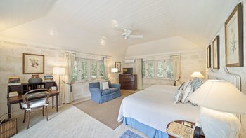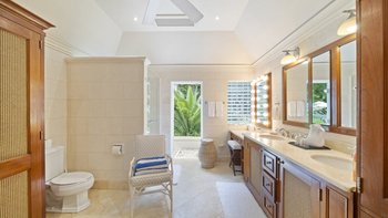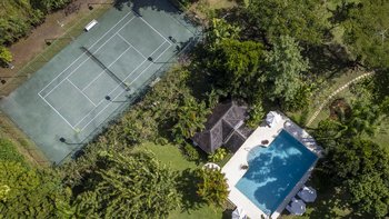 Dieser exklusive Rückzugsort liegt versteckt in einem 4 Hektar großen tropischen Garten und verfügt über einen riesigen Pool mit Liegestühlen und schattigen Brollies, um das idyllische Wetter wirklich optimal zu nutzen. Fabelhafte Außenbereiche sind auf dem Gelände verstreut für maximale Entspannung, darunter ein Pavillon und eine riesige Open-Air-Lounge, die mit ihren wunderschönen Sitzgelegenheiten, drapierten Vorhängen und aufwendigen Wasserspielen wie die Neunen gekleidet aussieht. In den weitläufigen Gärten gibt es sogar einen privaten Tennisplatz für die aktiveren Momente. Denen Villa selbst hat eine sehr OFFENER GRUNDRISS Atmosphäre und im Hauptgebäude ist die große Lounge einfach wunderschön. Es ist hell, weiß und wunderschön im klassischen Inselstil eingerichtet, mit schönen Zimmerpflanzen und riesigen offenen Fenstern, die die einladende Aussicht von außen genießen. Aller fünf Schlafzimmer hier haben den zusätzlichen Luxus eines eigenen Bades – und alle sind sehr geräumig, mit großen, bequemen Betten und neutralen Farbtönen, die das helle und luftige Gefühl verstärken. Deren Haupthaus hat nur zwei Schlafzimmer, und es gibt drei weitere, im Cottage-Stil aufgeteilte Zimmer daneben.