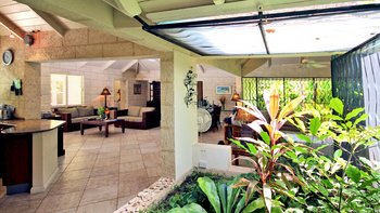 Diese vielseitige und familienfreundliche Villa ist eine unerwartete Oase der Ruhe und Stille in einer ruhigen Wohnsackgasse. Sie liegt versteckt in tropischen Gärten voller Palmen und duftender Blumen. Ein 13 Meter langer Swimmingpool bildet den Mittelpunkt des Grundstücks, mit Liegen auf der Poolterrasse und einer kleinen Essecke, die sich perfekt für ein Frühstück im Freien eignet. In dem hellen und luftigen Haus werden Korallensteinwände und hohe Holzdecken durch einzigartige Designelemente ergänzt, um natürliches Licht zu maximieren und ein Gefühl der Gelassenheit zu schaffen.