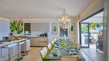 Nirvana ist eine himmlische Oase in St. James. Seine Lage könnte nicht viel näher am Strand sein, mit einer kleinen Treppe, die vom Garten direkt hinunter zum salzweißen Sand führt. Deren Villa selbst ist hell und modern, ganz in Weiß gehalten, mit luxuriösem Dekor und Statement-Stücken wie großen Spiegeln und komplizierten Kronleuchtern. Der Wohnbereich ist geräumig und OFFENER GRUNDRISS mit Plus-Sofas für Entspannung im Innenbereich, einer modernen Küche mit Frühstückstheke und einem langen Esstisch mit Blick auf das Meer. Große Glastüren führen auf die Terrasse, auf der die Gäste das Leben im Freien wirklich genießen können. Es gibt einen Esstisch im Freien mit einem großen Sonnenschirm für das Mittagessen im Schatten und einen separaten Bereich mit bequemen Sitzgelegenheiten, um sich zu entspannen und die Aussicht zu bewundern. Auf der Terrasse steht der Pool mit Liegestühlen am Pool, die sich zwischen dem Pool und dem Meer befinden.
