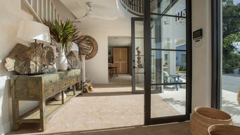 Wenn die Gäste die Villa über die Eingangshalle betreten, werden sie vom OFFENER GRUNDRISS Wohnzimmer und der offenen Küche begrüßt. Beiden Räume haben direkten Zugang zur Außenterrasse und sind geschmackvoll, weich und neutral eingerichtet, um eine beruhigende Atmosphäre zu schaffen.