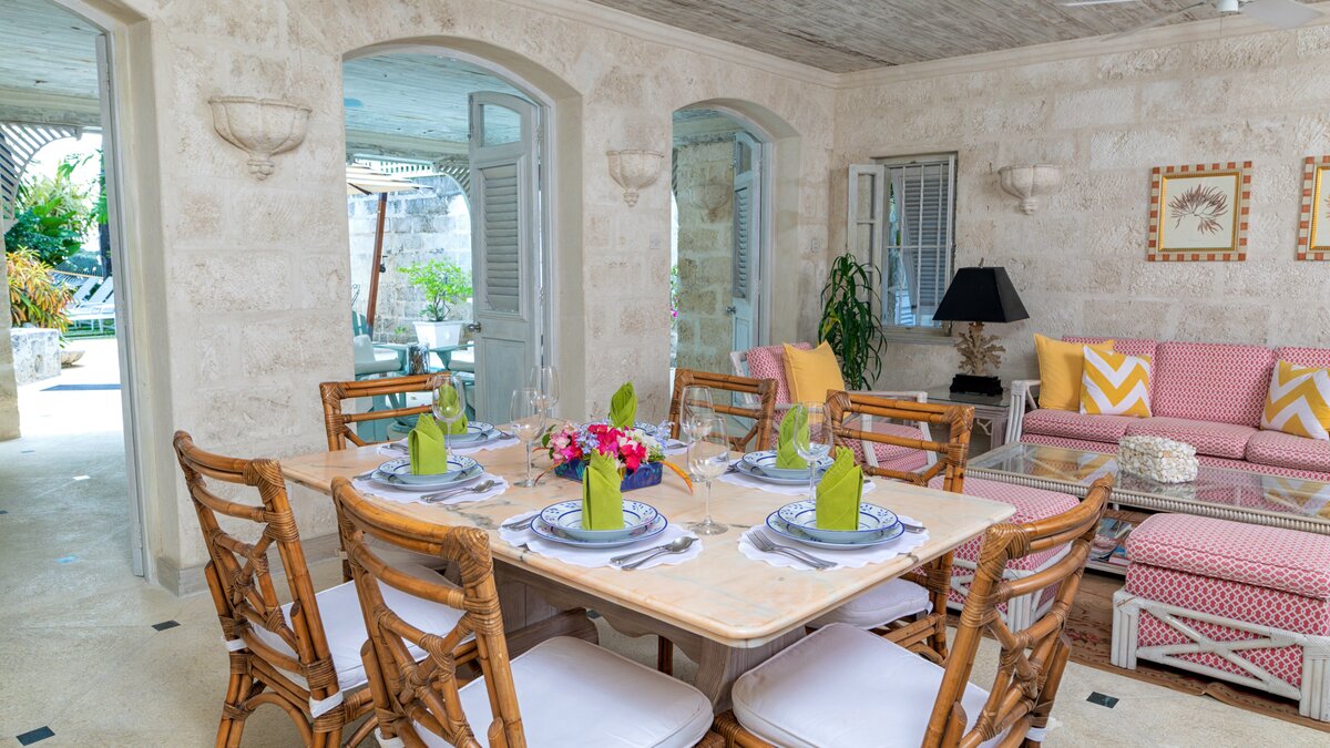 Kleine, aber üppige tropische Gärten führen von diesem hellen und luftigen Haus direkt zu den weichen Sandstränden des berühmten Gibbes Beach. Eingebettet in sie und natürlich von hohen Bäumen abgeschirmt, ist ein Tauchbecken in eine Korallensteinterrasse versenkt, angrenzend an eine Bar und einen Grill, ein schöner Esstisch im Freien und ein überdachter Sitzbereich, der in das Haus führt. Dessen geräumige Wohn-/Esszimmer ist stilvoll in sanften neutralen Farbtönen eingerichtet, und in drei klimatisierten Schlafzimmern sorgen ausgewählte Stoffe für die Eleganz des Landhauses. Deren Hauptschlafzimmer verfügt über ein eigenes Duschbad und einen eigenen Balkon, während sich die anderen beiden Zimmer ein zweites modernes Duschbad teilen.