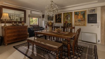 Im Inneren befindet sich ein gemütliches Wohnzimmer mit edlen Polstermöbeln und einzigartigen Kunstobjekten, eine offene Küche im Landhausstil mit Kücheninsel und ein Esszimmer mit einem großen Holztischund Stühlen und Kronleuchtern.