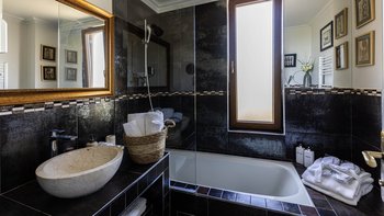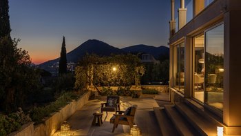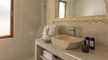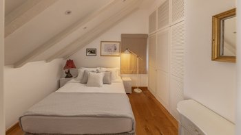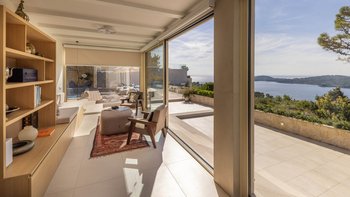 Im ersten und zweiten Stock befinden sich insgesamt sieben Schlafzimmer sowie fünf Bäder. Der Master-Suite im zweiten Stock verfügt über einen eigenen Wohnbereich mit Zugang zu einem kleinen Doppelschlafzimmer, während die drei Doppelschlafzimmer im ersten Stock alle zur Terrasse mit Meerblick führen.