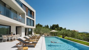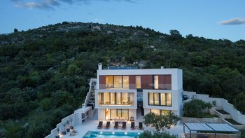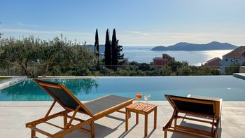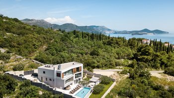 Diese neu erbaute Villa befindet sich über Dubrovnik und bietet herrlichen Meerblick, stilvolle moderne Möbel und einen beheizbaren Infinity-Pool.